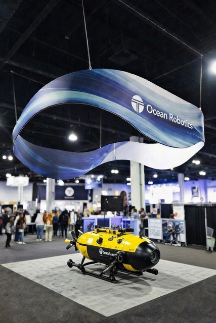 - Superior long-distance visibility – Suspended from the ceiling (typically 10-20 feet off the floor, depending on venue rules), they rise above crowds, booth walls, and other displays. This makes your brand name, logo, or key message visible from across the hall – often 50-100+ feet away – turning your booth into a “destination” rather than something people stumble upon.